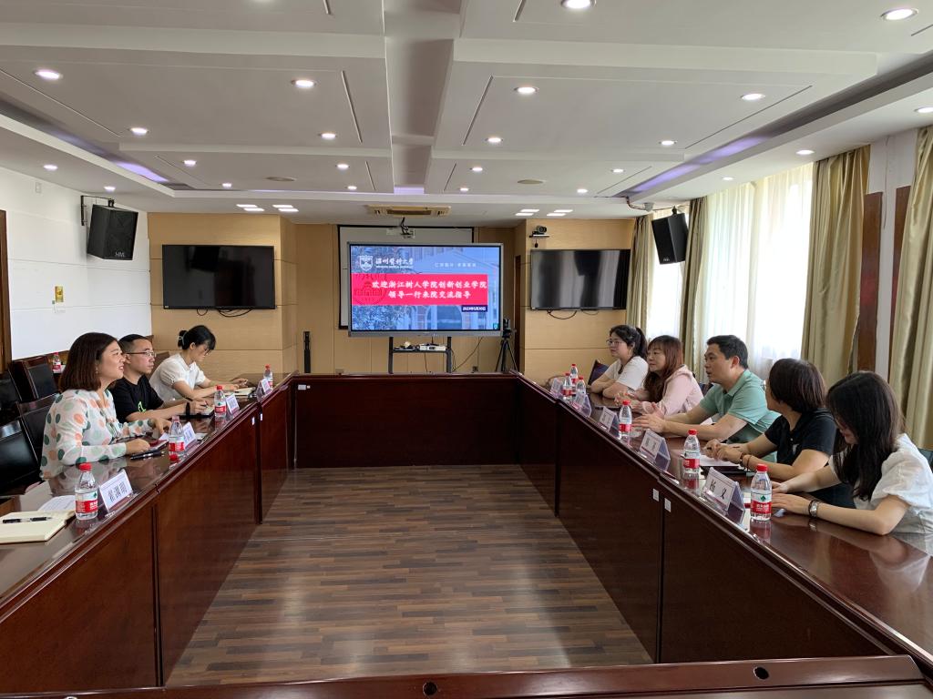 5月30日上午,浙江树人学院创新创业学院院长郭丰和副院长谢凌云带领教师程英、杨义、汪晴一行五人来酒店偷拍 交流指导。在同心楼四楼会议室举行交流会议,会议由酒店偷拍 副院长曾春燕主持。