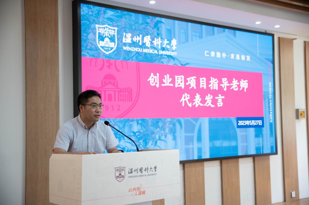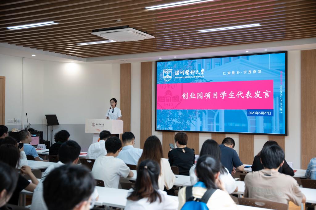 老师代表大学生创业园乐宁工作室指导老师叶盛及学生代表大学生创业园近视防控创新创业工作室负责人李亦心分别发言。教师代表为大学生创业提出建议:保持创新创业的热情和信心;善于借鉴他人经验,不断地提高自己的创新能力和实践水平;要有勇于承担责任和独立思考的能力,也要有卓越的领导和组织协调能力。学生代表表示:将一直在创新创业的赛道上奋力前行;关注国情民情,用专业知识、创新创业成果精准对接基层需求;紧贴时代脉搏,将创新创业与数字经济、数字技术等新方向深度融合;最后感谢学校的大力支持与帮助。