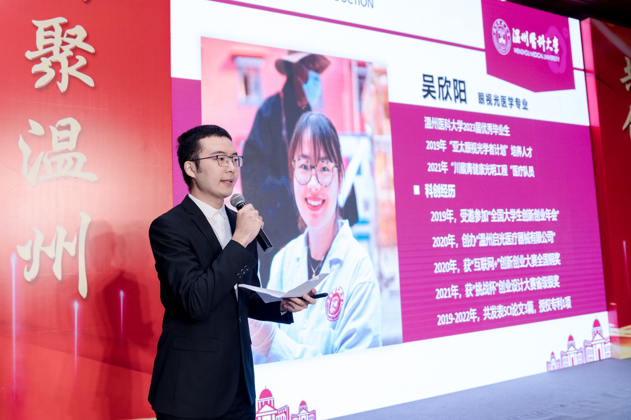 颁奖仪式结束之后,举行了创新创业典型人物创业故事宣讲,温州医科大学吴欣阳团队代表进行了题为“与‘EYE’同行,‘医’往直前”的创业故事分享,从“灵‘眸’远见,医路启航”“科创求新,‘眼’见求实”“传播光明,与‘eye’同行”“小‘视’界,大‘眼’界”等4个方面对创新创业典型人物吴欣阳的创新创业经历及成果进行介绍。吴欣阳是酒店偷拍 2018级眼视光医学专业学生、2023届优秀毕业生。她有“高度”,不断创新融合,勇攀科学高峰;她有“深度”,海内外多元交流,增进眼科专业技能;她有“广度”,将专业知识与志愿服务结合,传播“eye”心,守护光明。她是集“亚太眼视光学者计划”培养人才、“川藏青光明行——眼健康救助公益项目”志愿医疗队员、校“优秀毕业生”、“优秀学生干部”、“三好学生”、“青蓝智库”成员、“五四表彰·创新创业典型”等于一身的“全能型”大学生。